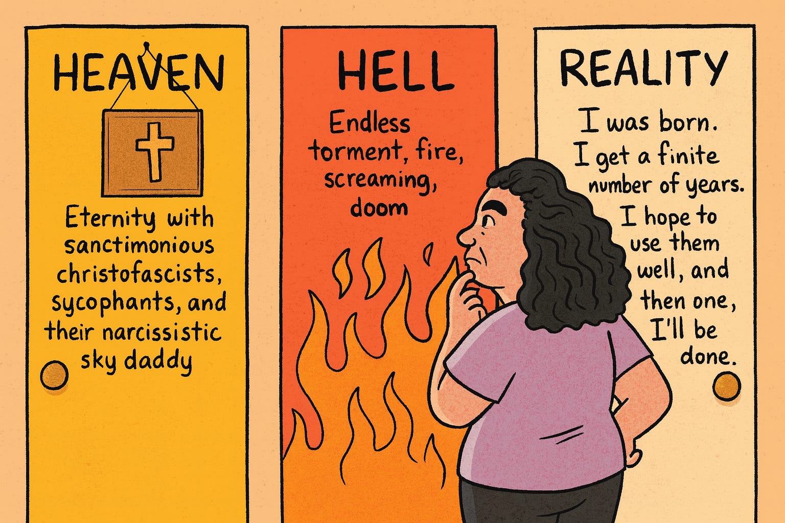 But snark aside, here’s the thing: this entire false choice is meaningless to me. Neither the threat of hell nor the promise of heaven concerns me. They don’t guide my ethics, shape my decisions, or loom over me like some divine HR department monitoring my performance.